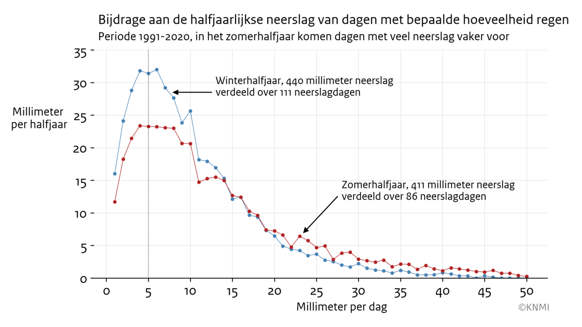 Ook in het zomerhalfjaar (april-september) en het winterhalfjaar (oktober-maart) zijn het de dagen met rond de 5 millimeter neerslag die het meest bijdragen aan de totale neerslag (afbeelding 2). Je ziet ook dat in vergelijking met de winter een groter deel van de totale neerslag in de zomer valt op dagen dat het veel regent (meer dan 15 millimeter).