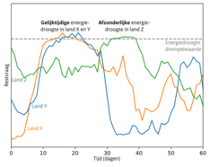 Het elektriciteitssysteem van de landen in Europa is sterk verbonden; er is een continue handel van elektriciteit. Bij gelijktijdige energiedroogtes is er minder ruimte voor die handel. Dan zijn andere oplossingen nodig, zoals eerder opgeslagen energie uit batterijen of stuwmeren. Omdat energiedroogtes meestal ontstaan door grootschalige weerpatronen, zijn gelijktijdige tekorten in meerdere landen een reëel risico. Ter illustratie laten we in afbeelding 1 een gelijktijdige energiedroogte in landen X en Y zien, terwijl land Z een energiedroogte heeft op een ander moment.