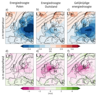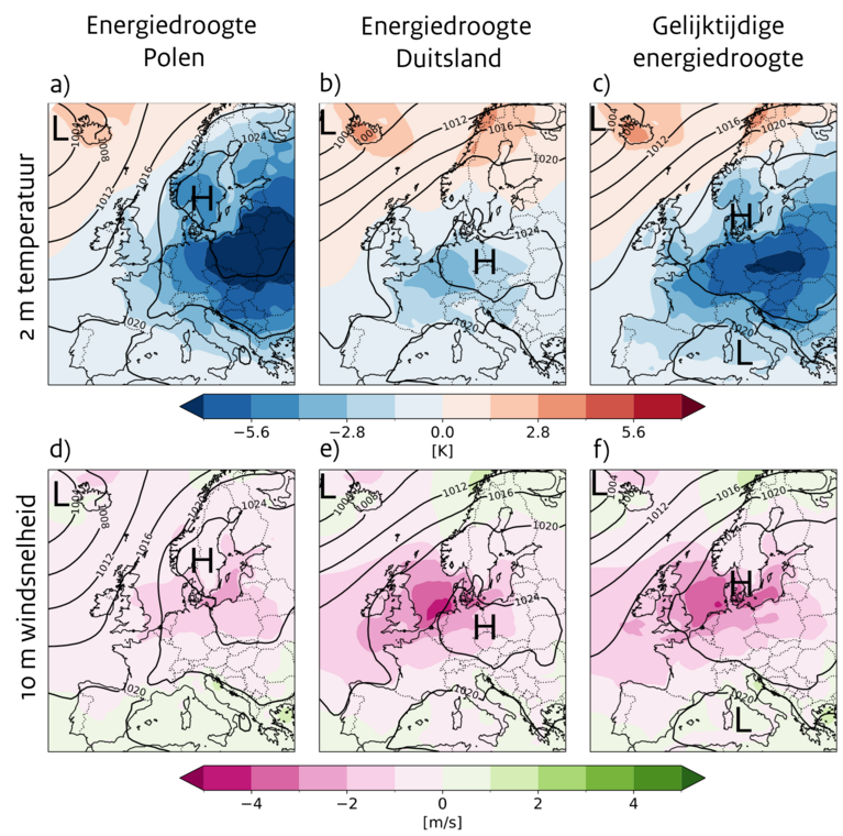 Buurlanden hebben niet altijd dezelfde gevoeligheden voor de invloed van het weer op de vraag en aanbod van elektriciteit. Voor een energiedroogte speelt zowel het lokale weer als het lokale energiesysteem een rol. In Noordwest-Europa staan veel windturbines, en speelt windsnelheid dus een grotere rol dan bijvoorbeeld in Polen. In Polen ontstaan energiedroogtes vooral door een hoge vraag, aangedreven door flinke kou (afbeelding 2). In Duitsland, met een grotere rol voor windenergie, komen energiedroogtes door een combinatie van kou én weinig wind.