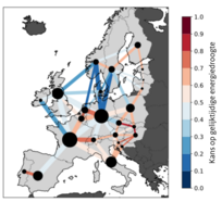 Dit verschil in weersgevoeligheid heeft directe gevolgen voor de kans op gelijktijdige energiedroogtes: als Duitsland een energiedroogte heeft, is er een kans van 50% dat Polen die op hetzelfde moment ook ervaart, en andersom. In afbeelding 3 is de kans op gelijktijdige energiedroogtes tussen alle buurlanden in Europa weergegeven. Blauwe lijntjes tussen landen laten zien dat er weinig gelijktijdige energiedroogtes zijn, dat is dus gunstig voor de energiezekerheid. Rode lijntjes duiden juist op een risico, doordat er vaak gelijktijdige energiedroogtes optreden.