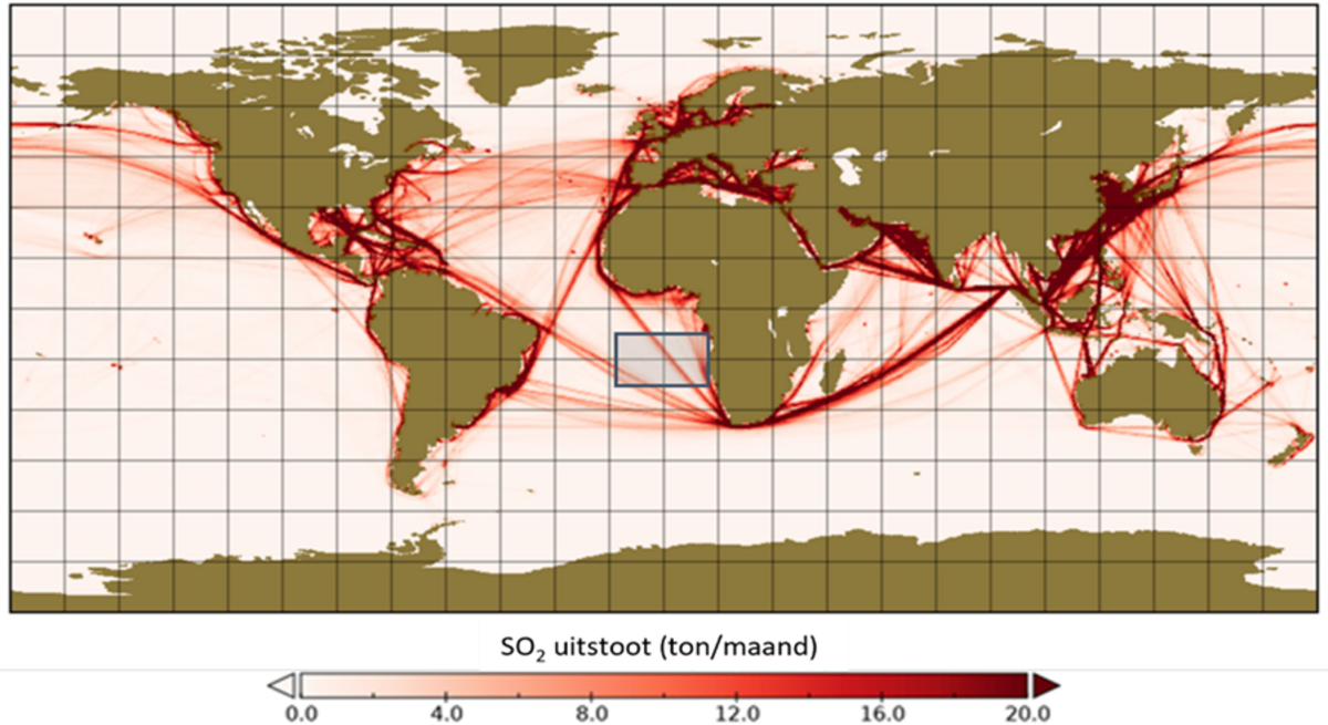 Bewegingen van schepen zijn doorgaans geconcentreerd in zogenoemde corridors. De meeste scheepscorridors lopen over het noordelijk halfrond (afbeelding 1). Afhankelijk van de locatie en het seizoen varen de schepen onder laaghangende bewolking en laten daarin extra reflecterende sporen achter, die met satellieten kunnen worden gedetecteerd. In langjarige observaties is die invloed het duidelijkst te zien in corridors waar langdurige bewolking aanwezig is en waar de heersende windrichting zodanig is dat de vervuiling binnen de corridor geconcentreerd blijft. In de zuidoostelijke Atlantische Oceaan (zie het grijze blokje in afbeelding 1) bevindt zich een corridor die in het bijzonder aan deze eigenschappen voldoet.