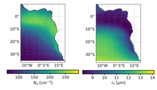 In metingen van de geostationaire Meteosat-satellieten vergeleken we de eigenschappen van wolken die wel en niet door scheepvaart werden beïnvloed. De genoemde scheepscorridor is in die metingen goed te herkennen, met zoals verwacht meer en kleinere druppels in de corridor ten opzichte van naastgelegen gebieden (afbeelding 2). Het verschil met het niet door scheepvaart verstoorde achtergrondniveau laat zien wat het effect is van de scheepvaartemissies op de wolken (afbeelding 3).
