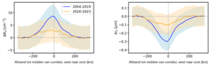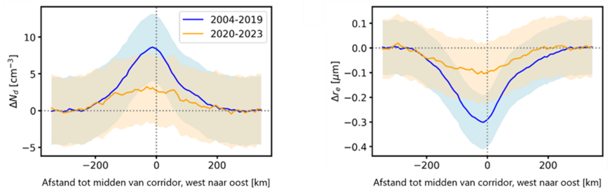 In 2020 voerde de Internationale Maritieme Organisatie (IMO) nieuwe regelgeving in om het gebruik van zwavel in scheepsbrandstof te beperken. Deze regelgeving heeft geleid tot vermindering van de uitstoot van aerosolen door zeeschepen. In de satellietmetingen is een duidelijk effect hiervan op de bewolking zichtbaar. Na 2020 is het verschil in wolkendruppels tussen de scheepscorridor en het gebied daarnaast een stuk kleiner geworden (oranje lijn in afbeelding 3): in de corridor bestaan de wolken uit minder, en grotere, druppels dan voorheen als gevolg van de afname in de hoeveelheid aerosolen.