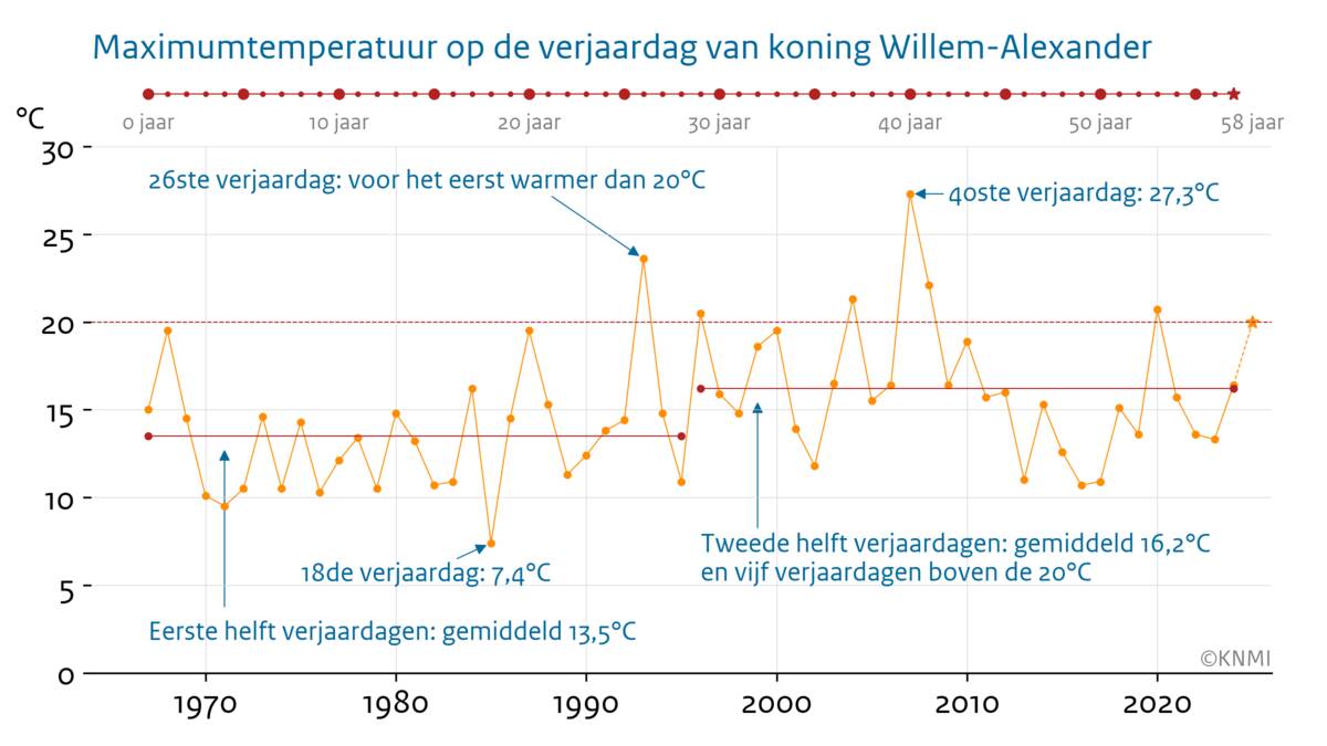 De temperatuur in zijn geboortejaar was gemiddeld 9,9 °C. Tijdens zijn leven is Nederland al met 2°C opgewarmd. Het afgelopen jaar, 2024, was het net als in 2023 recordwarm met een gemiddelde temperatuur van 11,8°C. Als de Koning 70 jaar wordt, in 2037, zal de gemiddelde jaartemperatuur rond deze waarde liggen. Met andere woorden, wat nu nog een recordwarm jaar is, zal rond 2037 al een gemiddeld jaar zijn. In het lage scenario blijft de opwarming beperkt en komt de gemiddelde jaartemperatuur wat lager uit, maar de verschillen tussen beide scenario's zijn tijdens het verdere leven van Willem-Alexander nog niet zo groot.