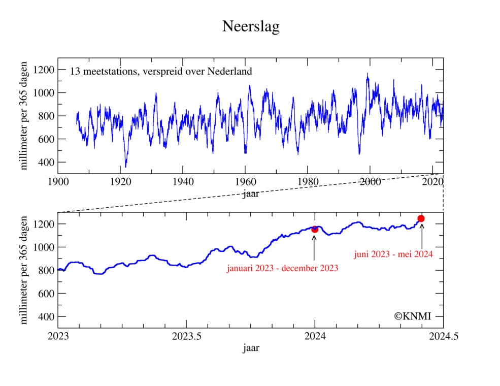 Vorig jaar was met landelijk gemiddeld 1153 millimeter het natste jaar van de meetreeks. Na vorig jaar waren er periodes met een lengte van één jaar oftewel 365 dagen die nog natter waren. De natste periode van 365 dagen van de meetreeks is die van 2 juni 2023 tot en met 31 mei 2024, oftewel de afgelopen 12 maanden. Deze periode was met 1246 millimeter 8 procent natter dan het jaar 2023 (afbeelding 2).