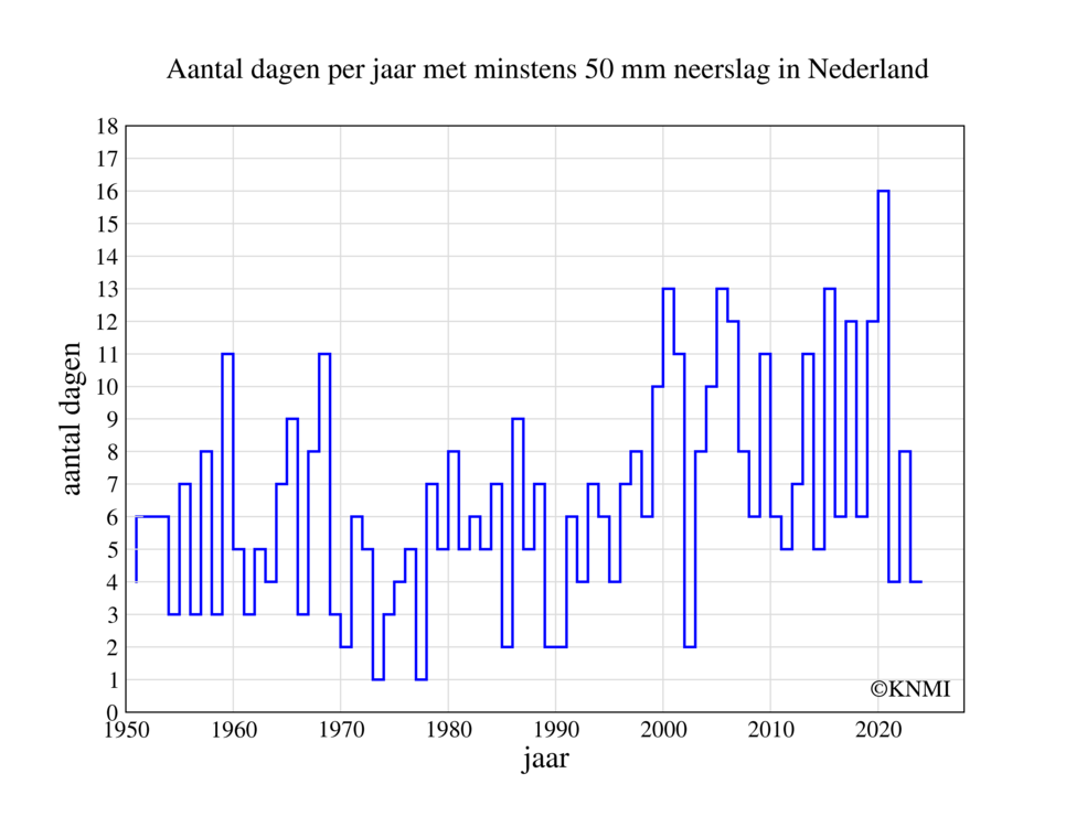 Plaatselijk meer dan 50 millimeter neerslag noemen we 'een dag met zware neerslag'. Het aantal dagen per jaar met zware neerslag op minstens één van de ruim 300 KNMI-neerslagstations is toegenomen: van gemiddeld ongeveer 5 in de tweede helft van de vorige eeuw naar 9 in deze eeuw (afbeelding 3). Dat heeft alles te maken met klimaatverandering: in een warmer klimaat bevat de lucht meer waterdamp, waardoor er meer neerslag uit een bui valt.