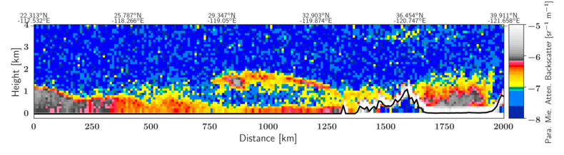 De EarthCARE satelliet is afgelopen 11 januari iets voor 02:00 ’s nachts ten westen van Los Angeles (LA) langs gevlogen en is ten noorden van Los Angeles over land gekomen. Boven de oceaan zien we dat een gedeelte van de rook is opgetild tot maximaal 2 kilometer (zie figuur 1). Daarnaast geven de gecombineerde ATLID-metingen ook de mogelijkheid om onderscheid te maken tussen de verschillende soorten fijnstof, zoals roet, organisch materiaal en stofdeeltjes. De laag fijnstof in het midden van de figuur, tot 2 kilometer hoogte, bestaat uit rook, terwijl de aerosol-laag in het zuiden (links) meer uit een combinatie van zeezout (marine aerosol) en rook bestaat. Boven land ten noorden van Los Angeles is het een combinatie van zeezout en plaatselijke uitstoot.