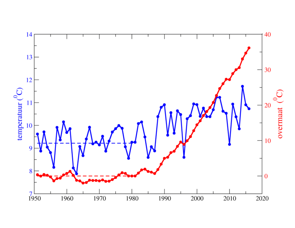 We passen de overmaat hier toe op de jaargemiddelde temperatuur in De Bilt sinds 1951 (Figuur 1, blauwe lijn) met als normaal de temperatuur gemiddeld over de periode 1951-1980 (blauwe stippellijn). In deze periode is de overmaat (rode lijn) steeds betrekkelijk klein want de afwijkingen zijn nooit lang achter elkaar positief of negatief. Per definitie eindigt de overmaat weer op nul aan het eind van de normaalperiode (rode stippellijn). Na 1980 neemt de overmaat echter vrijwel voortdurend toe omdat de jaartemperaturen vrijwel voortdurend hoger zijn dan normaal. De overmaat van de temperatuur vertoont veel minder schommelingen dan de temperatuur zelf, en is daarom bij uitstek geschikt om klimaatverandering in beeld te brengen.