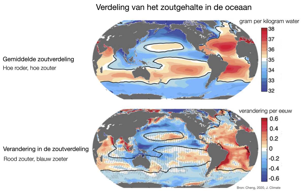 Uit metingen van het zoutgehalte van de oceanen blijkt dat de zeeën in de warme gebieden rond de evenaar steeds zouter worden (figuur 2). Dit komt omdat verdamping zoet water verwijdert, waardoor het zout achterblijft. Dit zoete water valt overwegend neer in de koelere gebieden, waardoor die steeds minder zout worden. Metingen laten zien dat het transport van zoet water van de (sub)tropen naar de poolgebieden tussen 1970 en 2014 ongeveer 46,000 – 77,000 kubieke kilometer bedroeg, wat gelijk staat aan een laag van 5 – 8 m over de gehele Verenigde Staten.