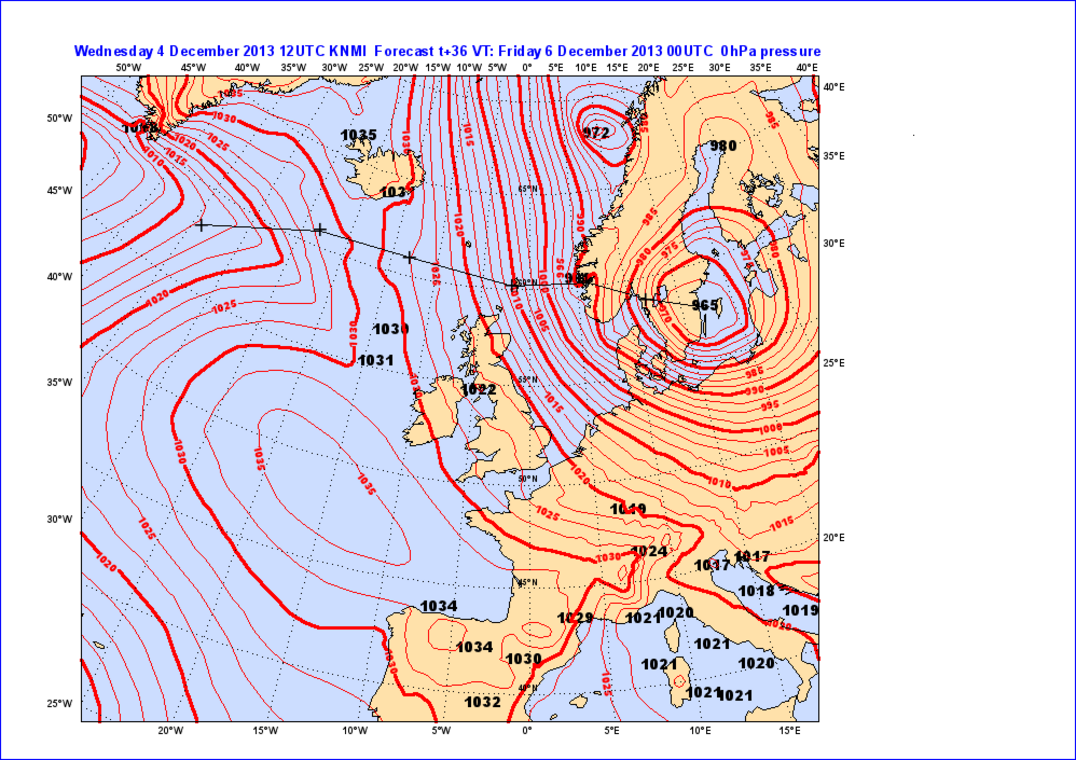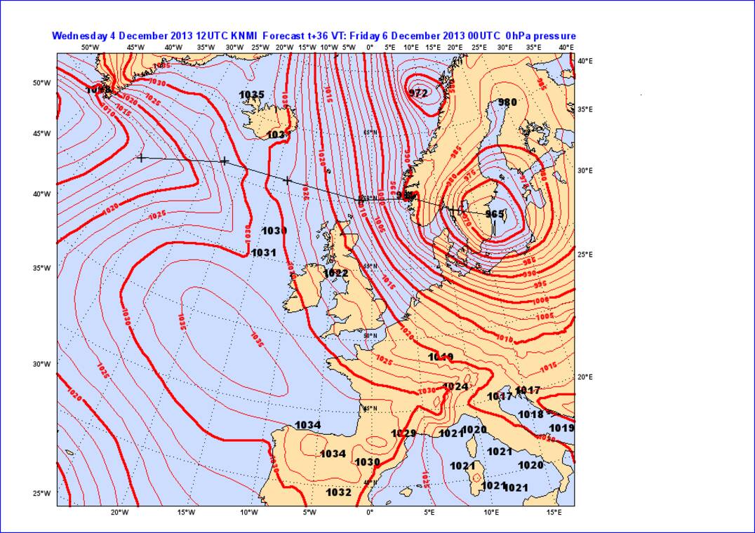 De depressie trok als een randstoring ten zuiden van Groenland langs en er volgde uitdiepend een route te zuiden van IJsland en vlak ten noorden van Schotland naar het zuiden van Noorwegen en Zweden.