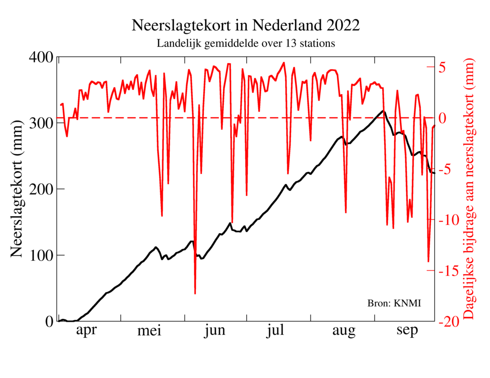 Het neerslagtekort is het verschil tussen verdamping en neerslag, per dag opgeteld in het zomerhalfjaar, van april tot en met september. Figuur 1 toont het verloop van het landelijk neerslagtekort dit jaar (zwarte lijn), en de bijdrage daaraan per dag: het dagelijkse verschil tussen de verdamping en de neerslag (rode lijn). Het neerslagtekort is positief, dat is normaal voor het zomerhalfjaar, er is dan altijd meer verdamping dan neerslag.