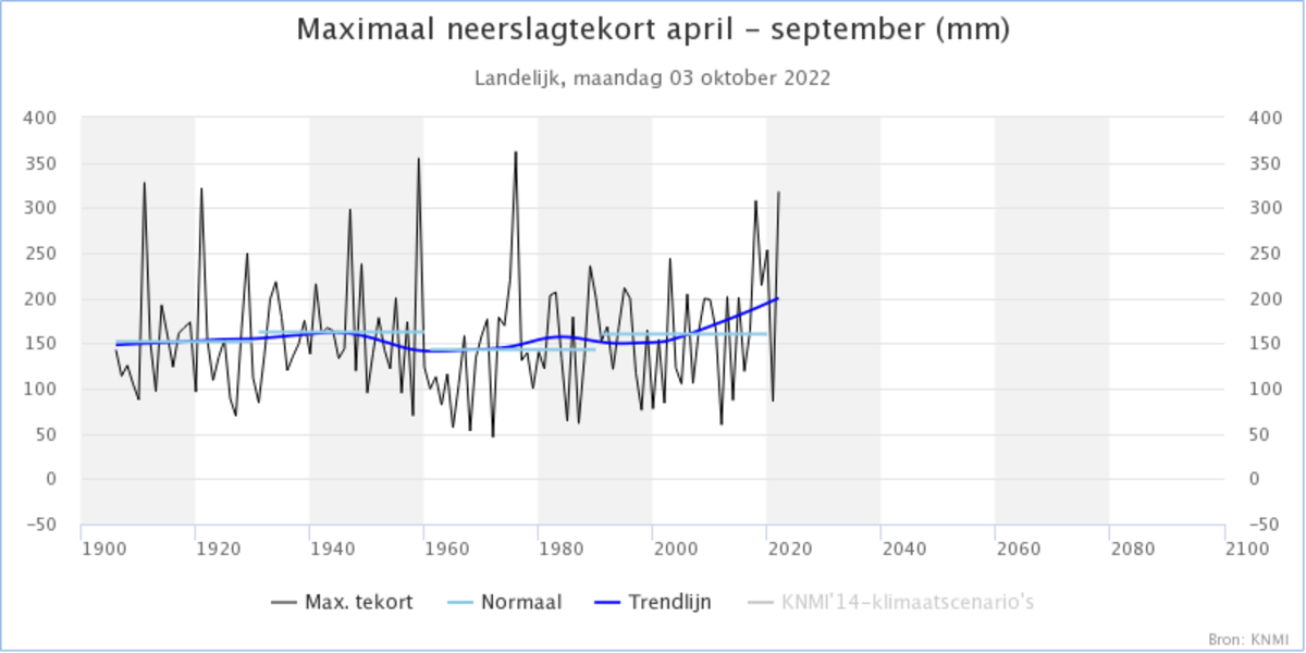 De rode pieken naar beneden zijn de dagen met veel regen, bijvoorbeeld 20 mei, 5 juni en 26 september. Op die dagen daalt het neerslagtekort. Een flinke piek van bijvoorbeeld 10 millimeter regen wordt echter al gauw door verdamping op een paar zonnige dagen weggewerkt, waardoor het neerslagtekort uiteindelijk toch oploopt. De maximale waarde van 318 millimeter, op 5 september, is twee keer zo hoog als normaal (160 millimeter) (figuur 2). Ondanks de zeer natte weken daarna bleef het neerslagtekort hoog. De waarde aan het einde van september, 224 millimeter, was na die in 2018 en 2003 de hoogste van deze eeuw.