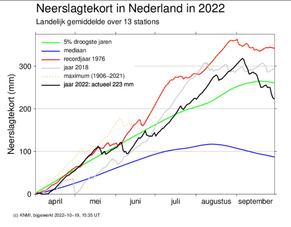 In Nederland is vanaf april de gemiddelde verdamping groter dan de gemiddelde neerslag. Van 1 april tot en met 30 september berekent het KNMI daarom het zogeheten neerslagtekort (figuur 1). Hiervoor wordt dagelijks voor 13 meetstations verspreid over Nederland het verschil berekend tussen de potentiële verdamping (hierna kortweg verdamping genoemd) en de neerslag, en worden die verschillen vanaf 1 april bij elkaar opgeteld. In de maanden april-juli is de verdamping -gemiddelde genomen- groter dan de neerslag, in augustus zijn beide ongeveer gelijk, en in september-maart is de neerslag groter dan de verdamping. Daarom loopt het neerslagtekort in de maanden april-juli op, wordt de maximale waarde meestal in augustus bereikt, en gaat het vanaf september weer omlaag.