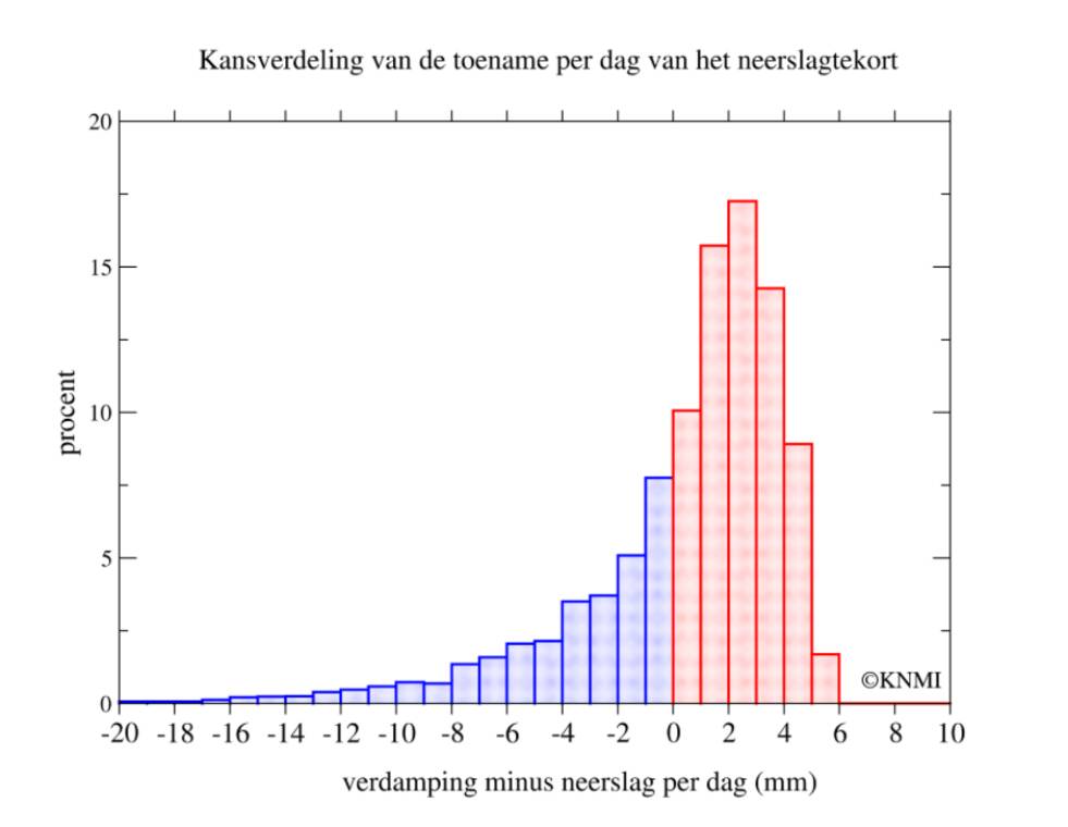 Het neerslagtekort gaat in het droogteseizoen gemiddeld omhoog, maar op dagen met veel neerslag gaat het tijdelijk omlaag. Uit de kansverdeling van het dagelijkse verschil tussen verdamping en neerslag (figuur 2) blijkt dat de verdamping op ongeveer 70 procent van de dagen groter is dan de neerslag (positief, rood) en op 30 procent kleiner (negatief, blauw). De verdamping neemt toe met de hoeveelheid zonnestraling en de temperatuur, en is op de zonnigste dagen maximaal 6 millimeter per dag (mm/dag). De afname van het neerslagtekort kan veel groter zijn, tot 16 mm/dag op dagen met veel neerslag, weinig zon, en dus weinig verdamping. De afnames zijn dus groter dan de toenames, maar komen minder vaak voor. Over alle dagen van april-september neemt het neerslagtekort toe met gemiddeld 0,5 mm/dag, oftewel 90 mm over de hele periode.