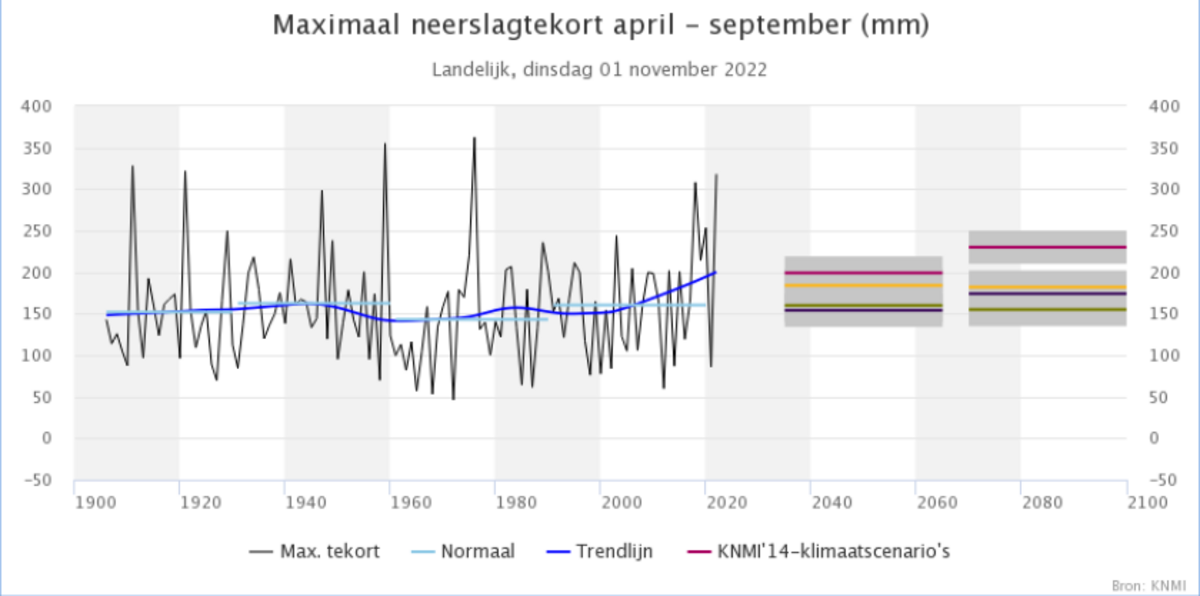 Het maximale neerslagtekort is sinds het jaar 2000 toegenomen, vooral door de vier recente droge jaren 2018, 2019, 2020 en 2022 (figuur 3). Door de trend naar hogere temperaturen en meer zonnestraling stijgt de komende jaren de verdamping. De kans op droogte in het voorjaar en in de zomer wordt daardoor groter. Uit attributieonderzoek na de droge zomer van 2018 blijkt dat in het Nederlands binnenland de kans op droogte is toegenomen. In de kustgebieden kan dat nog niet aangetoond worden, doordat de zomerneerslag daar is toegenomen.