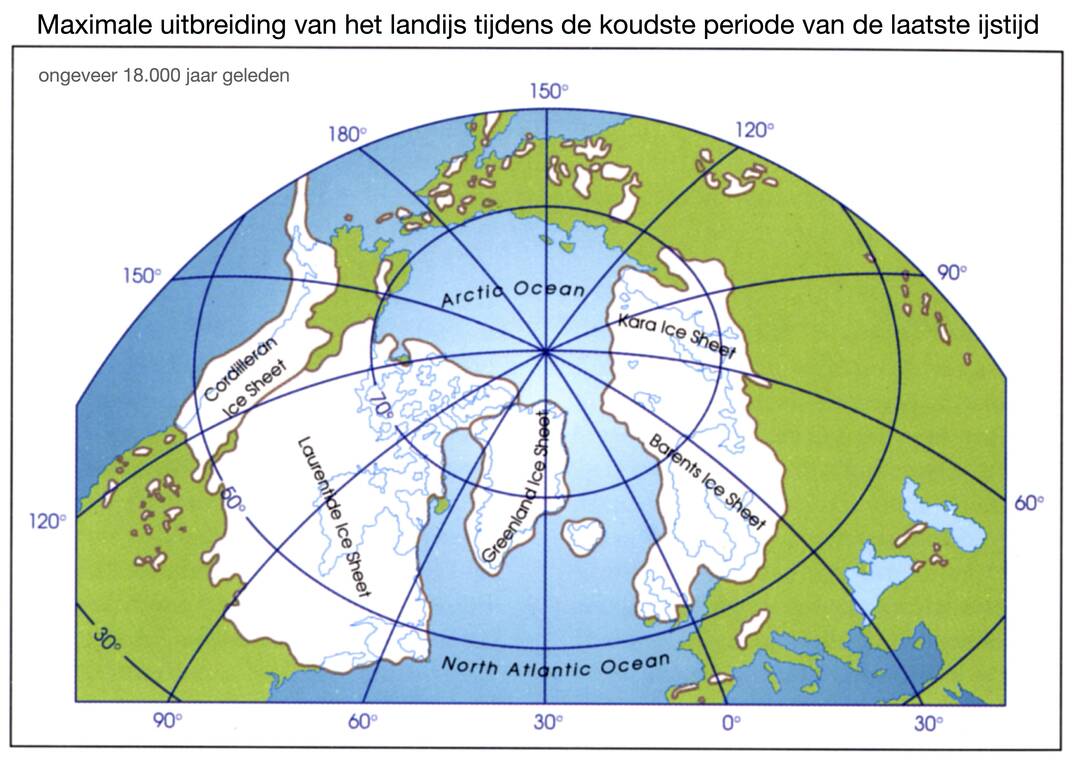 Interglacialen, de relatief korte periodes tussen ijstijden (glacialen) in, zoals het huidige tijdperk het Holoceen, kenmerken zich door milde omstandigheden. Gedurende de afgelopen miljoen jaar zijn de ±100.000 jaar lange glacialen echter de norm, met enorme ijskappen in Noord-Amerika en Eurazië (figuur 1). De temperatuur in onze regio was gemiddeld zo’n 10 graden lager dan nu, en tijdens periodes van maximale ijsuitbreiding was het nóg kouder: 15 - 20 °C (figuur 2).