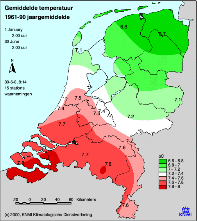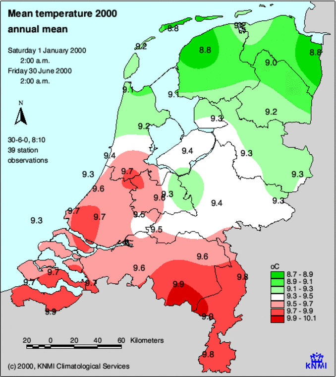 De gemiddelde temperatuur over de eerste zes maanden van dit jaar is in De Bilt uitgekomen op 9,6 graden, terwijl 7,5 voor deze periode normaal is. Een uitzonderlijk grote afwijking waardoor het jaar 2000 verzekerd is van een plaats temidden van de warme jaren. Sinds het begin van de waarnemingen in 1706 is zo'n afwijking over de eerste helft van jaar slechts twee keer voorgekomen. De eerste helft van 1990 was de warmste met 9,9 graden, gevolgd door de eerste helft van 1998 met 9,8 graden. In 1822 lag de gemiddelde temperatuur over januari-juni op 9,5 gradenBron: Jan Visser