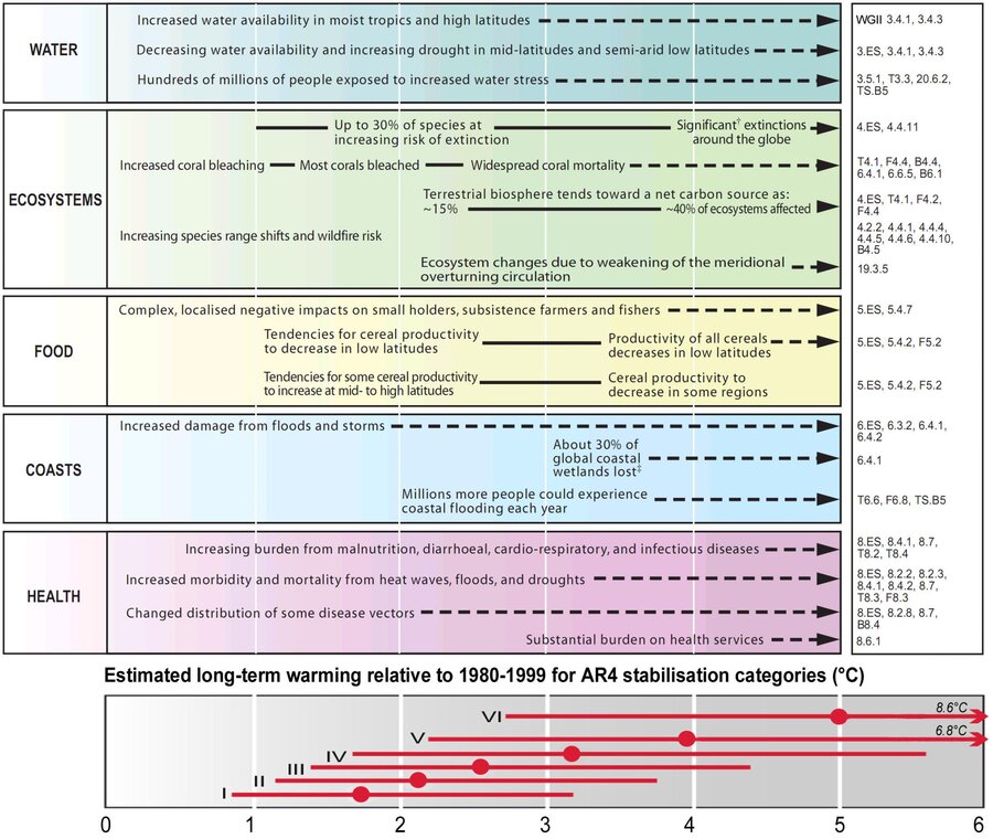 De figuur combineert de inzichten uit werkgroep II over mogelijke gevolgen van klimaatopwarming, bij verschillende waardes voor de opwarming (bovenste paneel), met de door werkgroep I gepresenteerde modelberekeningen van de opwarming bij verschillende socio-economische scenario’s.