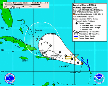 De verwachting is dat Erika vrijdag voor of boven Puerto Rico in kracht afneemt. De daaropvolgende dagen zal ze als tropische depressie in noordwestelijke richting verder gaan waar onder meer Dominicaanse Republiek, Haïti en de Bahama’s last van regenbuien en windstoten kunnen hebben.