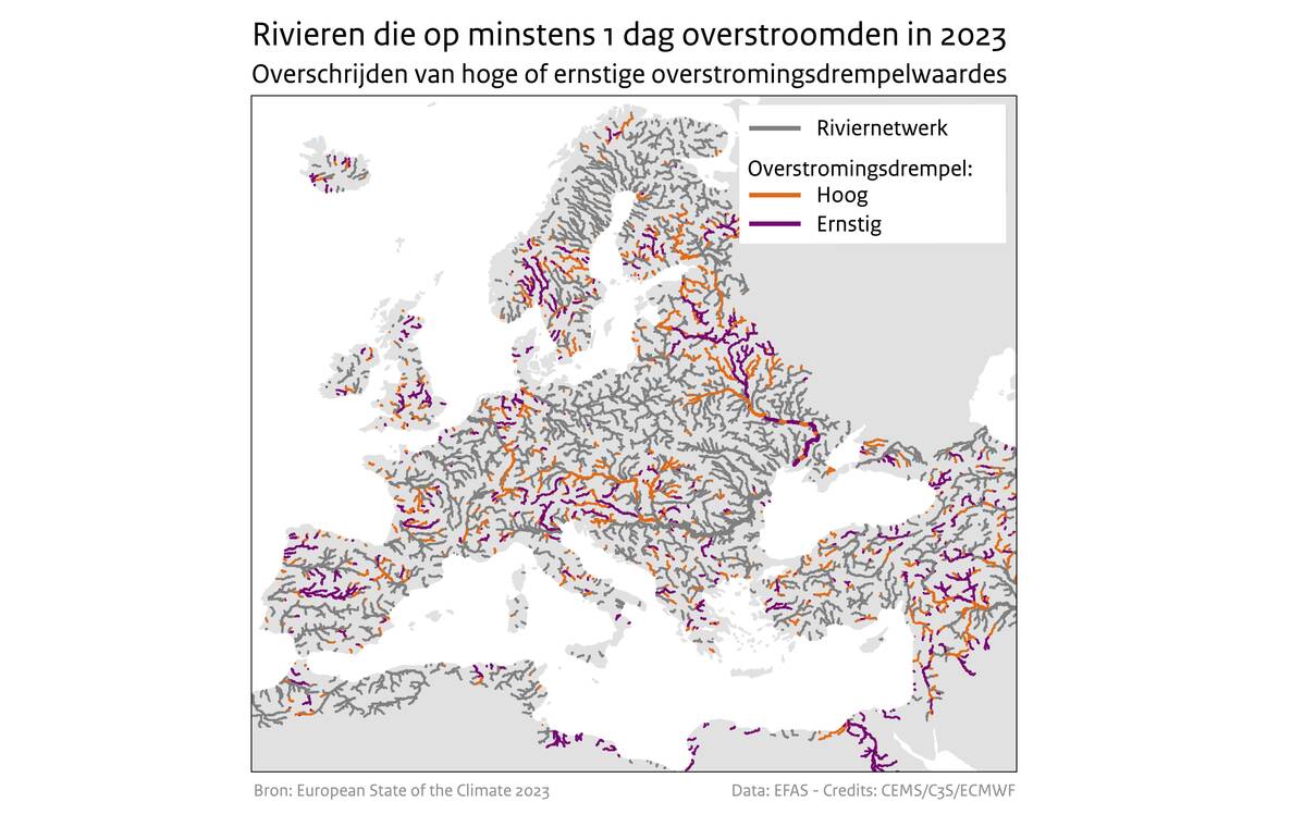 Er viel ongeveer 7 procent meer neerslag in Europa in 2023 dan gemiddeld over 1991-2020. Er trokken relatief veel weersystemen vanuit het westen over Europa die extra veel regen brachten door de uitzonderlijk hoge oceaantemperaturen. In heel Europa traden rivieren buiten hun oevers (afbeelding 2). In ongeveer een derde van de rivieren steeg op enig moment de afvoer uit boven de 'hoge' overstromingsdrempelwaarde. De 'extreem hoge' drempelwaarde werd bereikt in 16% van de rivieren. Vooral in december was de rivierafvoer van bijna een kwart van de Europese rivieren ‘uitzonderlijk hoog’ met veel overstromingen tot gevolg.