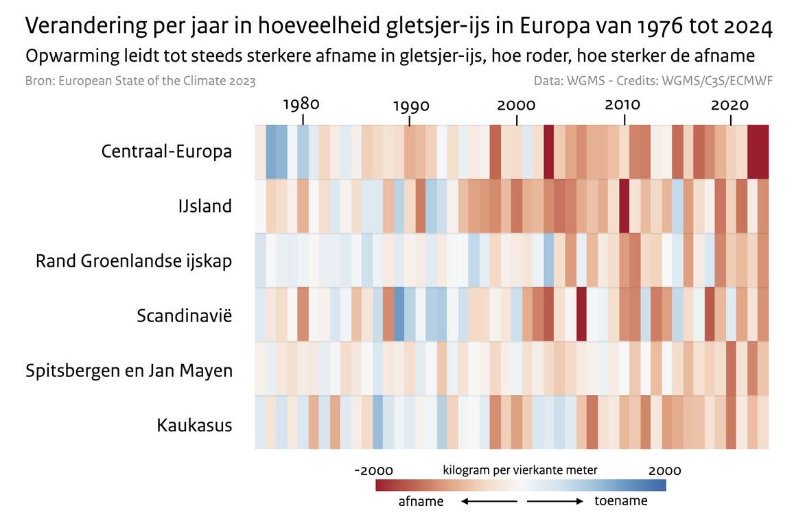 In centraal Europa en het Alpengebied heeft het op minder dagen gesneeuwd dan normaal, voornamelijk in de winter en lente. Samen met de warmte heeft dit gezorgd voor een afname in gletsjerijs in heel Europa. In het Alpengebied hebben gletsjers tot wel 10% van hun volume verloren in 2022 en 2023. De veranderingen in de tijd voor verschillende gletsjergebieden in Europa is te zien in afbeelding 3. In heel Europa zien we in de loop van de tijd steeds sterkere afnames in gletsjerijs.