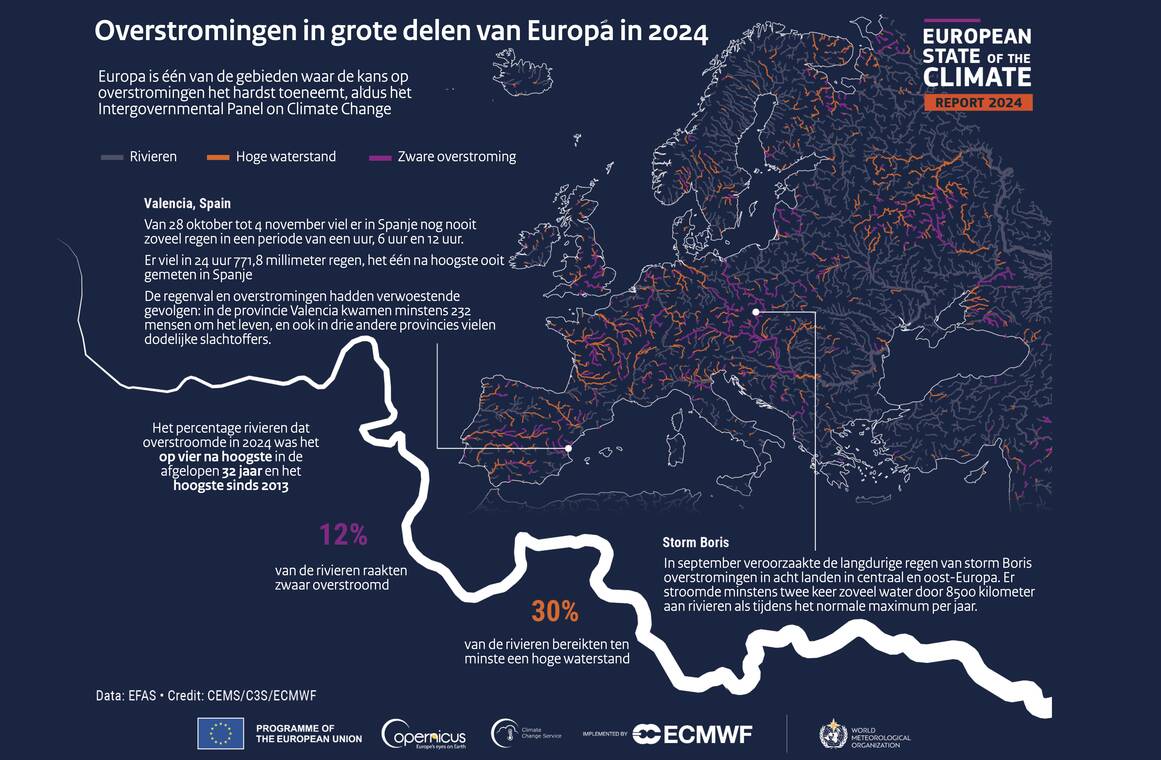 De extreme neerslag in 2024 zorgde ervoor dat in ongeveer 30 procent van de Europese rivieren het water boven het waarschuwingsniveau “hoog” is komen te staan, en voor 12 procent van de rivieren kwam het zelfs tot “extreem hoog”.