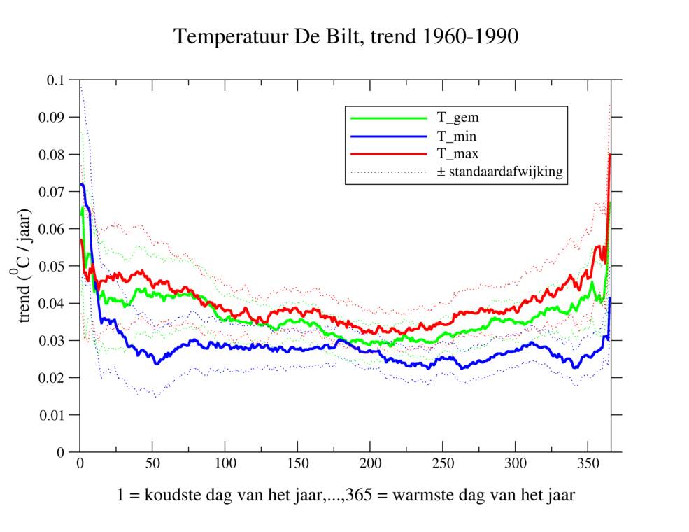 Figuur 1 toont de trend in de temperatuur in De Bilt voor de periode 1960-2019 voor 365 dagen, waarbij dag 1 de koudste dag van het jaar is, dag 2 de een-na-koudste dag, enzovoorts, en dag 365 de warmste dag van het jaar. Het gaat om de trend in de etmaalgemiddelde temperatuur (groene lijn), de dagelijkse minimum temperatuur (oftewel nachttemperatuur, blauwe lijn), en de dagelijkse maximumtemperatuur (oftewel middagtemperatuur, rode lijn).