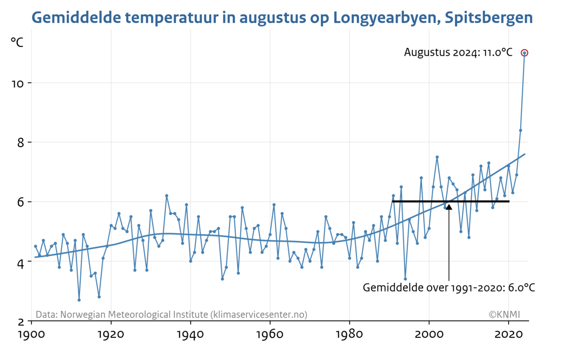 Het was echter vooral de maand augustus die eruit sprong. Augustus 2024 was met een gemiddelde temperatuur van 11,0 °C welgeteld 2,6 °C warmer dan het vorige record, en niet minder dan 5,0 °C warmer dan het gemiddelde van 1991-2020 (afbeelding 2). Vóór 2020 haalde geen enkele augustus de 9 °C. Deze warmtegolf ging gepaard met temperaturen overdag van boven de 20 °C, wat hiervoor in augustus nog nooit was opgetreden (vorige record: 18,1 °C).
