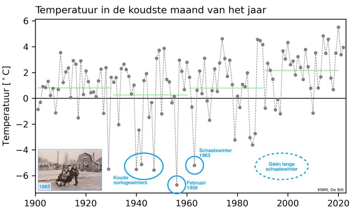 Nu ik zelf meerdere keren per dag de luiers van mijn zoontje verschoon, denk ik regelmatig aan mijn oma (1930). Zij vertelde vaak over mijn vaders geboorte en haar kraamperiode. Het was toen zo koud dat de luiers na het wassen bevroren aan de waslijn. Inderdaad, na controle blijkt dat februari 1956 de koudste maand was sinds 1901 (figuur 1, gemiddeld min 6,7 graden!).