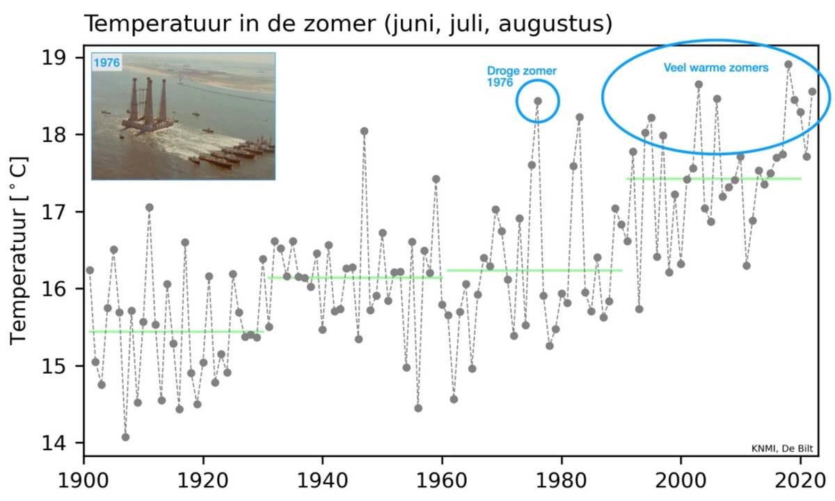 Zomers bracht de familie door op het water, en dus vertelt men verhalen over zeilavonturen in de Biesbosch. De zomer van 1976 was er een van strakblauwe luchten, heet en droog weer (figuur 2). Echter, mijn vader Peter (1956), toen net werkzaam in de zeesleepvaart, was voor langere tijd op zee. Bij terugkomst in september of oktober van dat jaar, herinnert hij zich vooral de extreme stank in de haven van Rotterdam, veroorzaakt door het lage water van slechte kwaliteit.