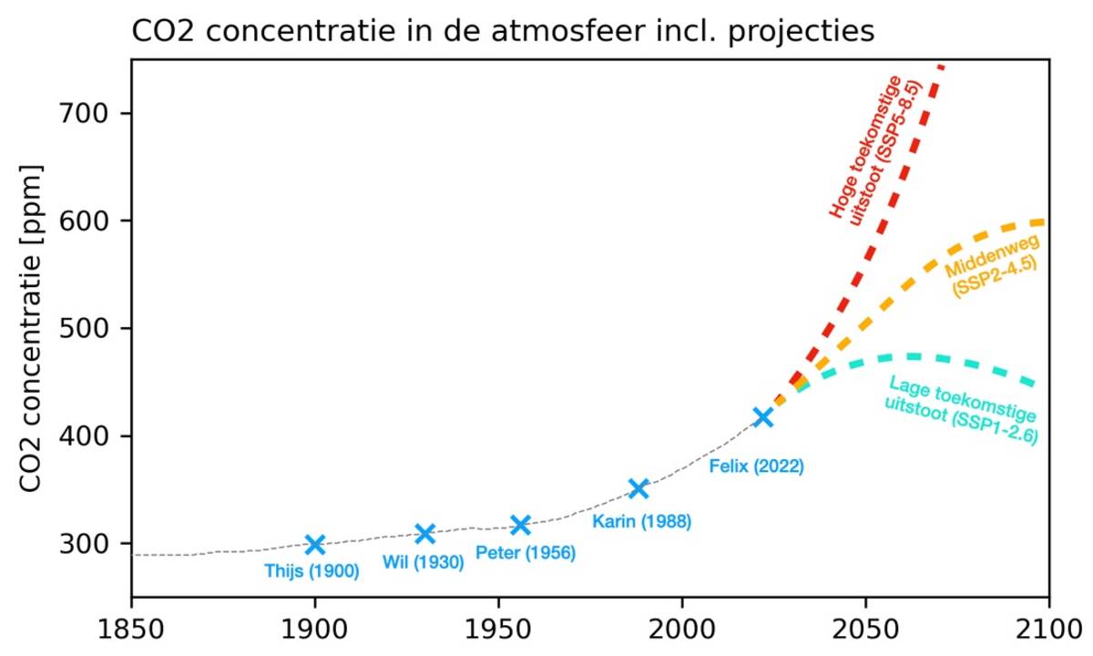 De oorzaak van de verandering van het typisch Nederlands weer ligt natuurlijk in de toename van broeikasgassen in de lucht (figuur 3). Daardoor warmt de aarde op en verandert wereldwijd het klimaat. Bij de geboorte van mijn overgrootvader Thijs (1900) was de hoeveelheid CO2 in de lucht zo’n 299 ppm (parts per million, één CO2 molecuul per miljoen luchtmoleculen), in mijn geboortejaar (1988) was dat al opgelopen tot 351 ppm, op het geboortekaartje van mijn zoontje (2022) heb ik 417 ppm geschreven (figuur 3). Als de uitstoot niet drastisch wordt verminderd, zal dat 500 ppm zijn bij weer een volgende generatie.