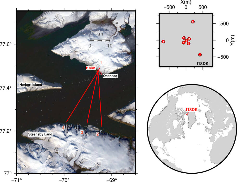 Onderzoek naar infrageluidmetingen geeft aan dat de gletsjers rondom het station tijdens de zomermaanden infrageluid opwekken, terwijl de gletsjers tijdens de winter stil zijn. Door de richting te bepalen waaruit dit infrageluid komt, kan de bron achterhaald worden. Iedere zomer bleken er gletsjers te zijn die infrageluid opwekken (figuur 2) dat vanuit een specifieke richting komt. Drie gletsjers op zo’n 30 kilometer afstand zijn geïdentificeerd en een nabij het station op slechts 2 km (figuur 1).