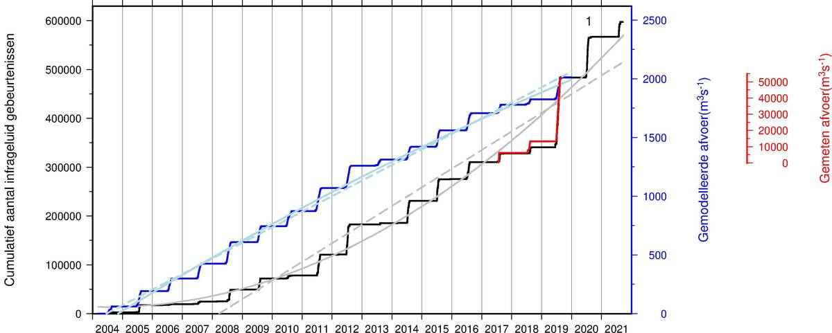 De infrageluid analyse is uitgevoerd met een continue meetreeks van 18 jaar. Gedurende deze periode blijkt dat de gletsjers vaker geluid zijn gaan maken. De verschillen tussen de jaren zijn groot, maar er is een stijging in het aantal infrageluid gebeurtenissen te zien. Voor de landgletsjer is dit vergeleken met een model en metingen van smeltwater (figuur 3). Het model laat overeenkomsten zien met jaren van weinig en veel infrageluid gebeurtenissen, gedurende de smeltseizoenen. Maar er zijn ook verschillen die verder onderzocht gaan worden. Voor de paar jaar dat er metingen van de hoeveelheid smeltwater zijn, lijkt er een goede overeenkomst te zijn met de infrageluid gebeurtenissen.