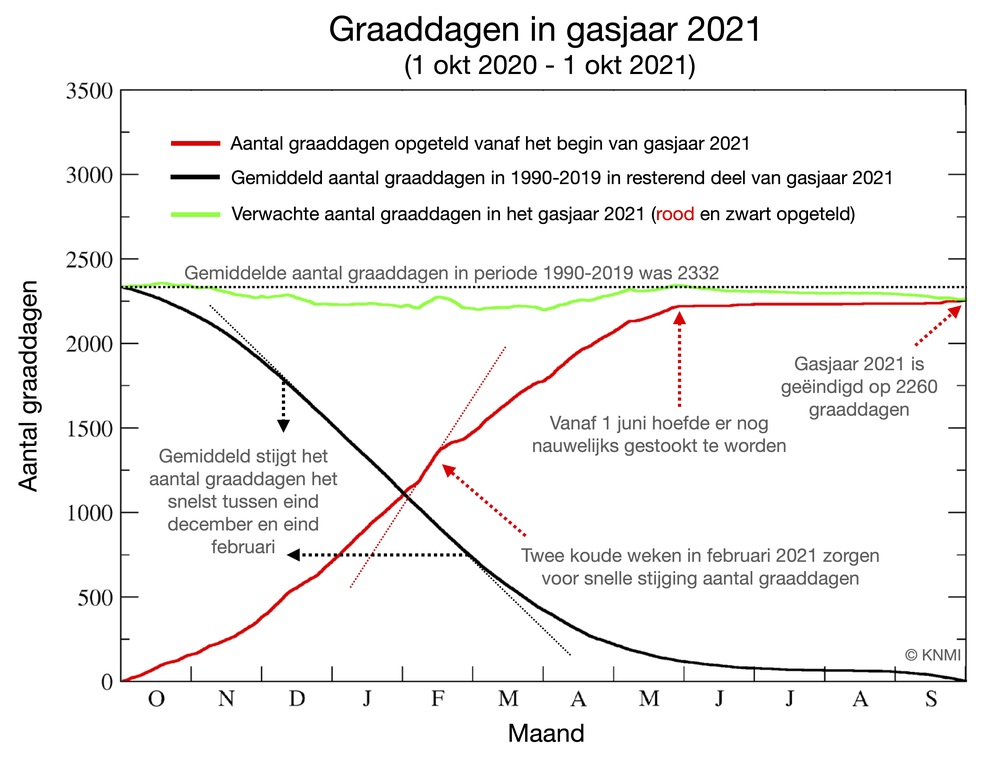 De som van de twee graaddagen (groene lijn) is het geschatte aantal graaddagen voor het hele gasjaar. Aan het begin van het gasjaar is deze gelijk aan de klimatologie (zwarte lijn), aan het einde volgt deze geheel uit de waarnemingen in het betreffende gasjaar (rode lijn). De groene lijn gaat omhoog in de tweede week van februari en in april 2021, toen het koud was voor de tijd van het jaar. Van november 2020 tot begin februari 2021 was het juist warm voor de tijd van het jaar, en gaat de groene lijn omlaag. De groene lijn eindigt iets lager dan hij begint: het aantal graaddagen in gasjaar 2021 (2260) was iets kleiner dan gemiddeld over de afgelopen 30 jaar (2332). De graaddagen vertonen door de opwarming van de aarde een dalende trend, maar uitschieters naar boven blijven mogelijk.