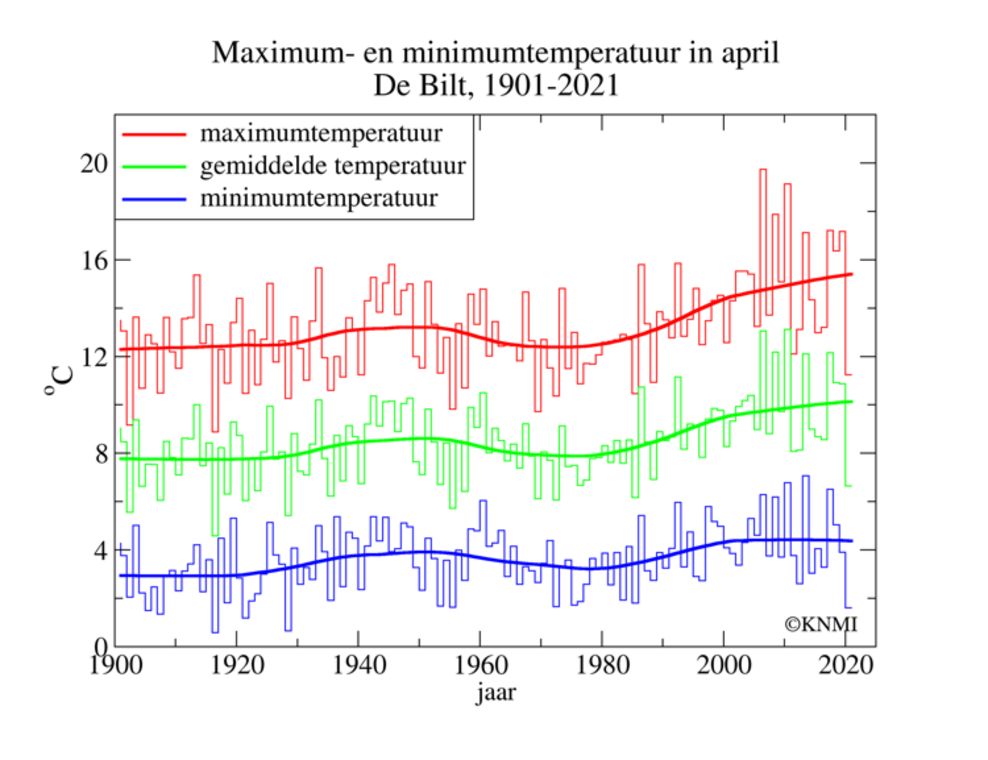 Wat opvalt aan de temperaturen in april is dat de verandering in de minimum- en de maximumtemperatuur redelijk gelijk opging tot eind vorige eeuw (figuur 2). Sindsdien is de maximumtemperatuur door blijven stijgen, maar is de minimumtemperatuur nauwelijks veranderd. Hierdoor loopt de periode met vorst in het groeiseizoen in de laatste twintig jaar snel op. De oorzaak hiervoor is nog onduidelijk.