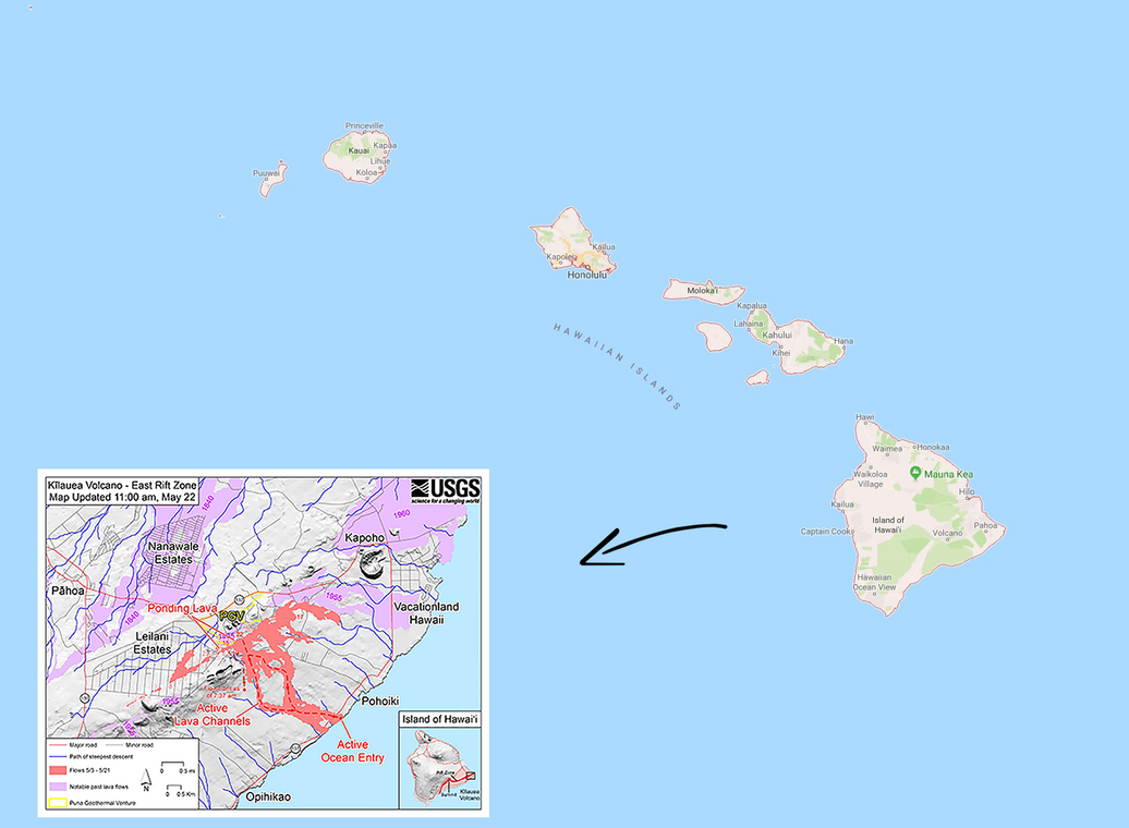 Aan de andere kant van de wereld, in de Stille Oceaan, liggen de eilanden van de Hawaïaanse archipel. Het grootste eiland van de keten, waarop vulkaan KIlauea ligt, heet Hawaï maar wordt om verwarring te voorkomen ook wel Big Island genoemd. Deze keten van vulkanische eilanden is ontstaan door de beweging van de aardkorst over de Hawaï hotspot, een plek waar warm materiaal vanuit de diepte naar het aardoppervlak beweegt. Behalve boven hotspots kunnen vulkanen ook ontstaan aan de randen van de tektonische platen. Dit gebeurt zowel als de platen van elkaar af bewegen (divergentie) als wanneer de platen naar elkaar toe bewegen (convergentie) waarbij de ene plaat onder de andere duikt (subductie).