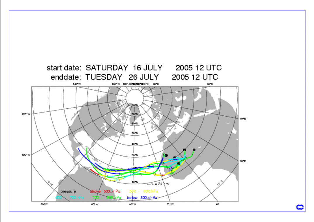 Eind juli 2005 bevond zich boven de Atlantische Oceaan tussen Afrika en het Caribisch gebied een grote zandstorm. Hierin bewoog zich zand afkomstig uit de Sahara met de passaatwind in westelijke richting.