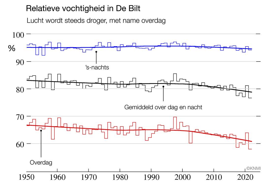 In Nederland is de relatieve luchtvochtigheid sinds halverwege de vorige eeuw afgenomen, van jaargemiddeld in De Bilt 83 procent rond 1950 tot 78 procent nu (figuur 1, zwarte lijn). Dit zijn gemiddelden over de dag, de verschillen tussen dag (minimale waarde) en nacht (maximale waarde) zijn groot, ongeveer 30 procent (rode en blauwe lijn). Dit komt doordat bij de hogere temperatuur overdag de lucht meer vocht kan bevatten. En de hoeveelheid vocht dus klein is ten opzichte van de verzadigingshoeveelheid.