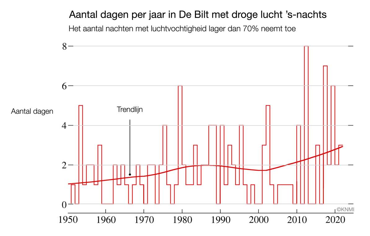 Als de luchtvochtigheid ’s nachts echter ook laag blijft, dan blijft dit herstel uit. Dat effect treedt tal op als de relatieve luchtvochtigheid niet boven de 70 procent uitkomt. Gemiddeld ligt de maximale luchtvochtigheid 's-nachts rond de 95 procent (figuur 1). Dagen met 's-nachts minder dan 70 procent luchtvochtigheid komen weinig voor. Maar hun aantal neemt wel toe, van ongeveer één per jaar in De Bilt rond 1950 tot drie per jaar nu (figuur 3).