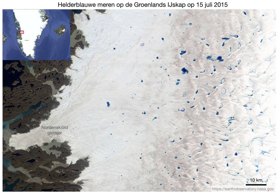 Wie naar Canada of de Verenigde Staten reist en over Groenland vliegt, kan vanuit grote hoogte soms helderblauwe meren op de ijskap onderscheiden (figuur 1). Ze vormen een ingewikkeld netwerk waarlangs het smeltwater uiteindelijk naar de rand van de ijskap stroomt, en van daaruit naar zee. Het water van deze meren is veel donkerder dan het omliggende ijs en warmt op door de zon, waardoor de bodem van de meren verder kan afsmelten. Niet ongewoon is dat zo’n meer ineens leegloopt door een onderliggende scheur in het ijs. Het smeltwater stroomt daarna verder omlaag en komt terecht tussen het onderliggende gesteente en de bodem van de ijskap.
