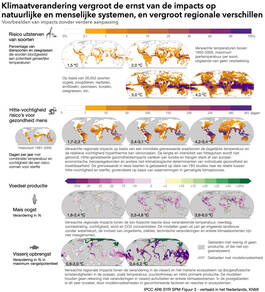 Veranderingen in weer en klimaat zijn natuurlijk niet zonder gevolgen. En ook hier geldt dat een kleinere klimaatverandering minder grote risico’s geeft voor mens en natuur. Er is bijvoorbeeld uitgezocht dat het risico op sterfte als gevolg van hitte en vochtigheid aanzienlijk kleiner is bij 2 graden klimaatverandering dan bij 5 graden klimaatverandering (Figuur 2). Ook de negatieve gevolgen voor voedselproductie, voor de visserij, en zelfs het uitsterven van diersoorten, zijn kleiner in een wereld met minder klimaatverandering.