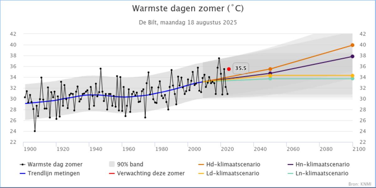 Een periode van hitte zoals vorige week komt in het klimaat van nu gemiddeld eens in de twee jaar voor en is daarmee niet heel uitzonderlijk. Vroeger was dat anders: in De Bilt is de kans op zo’n gebeurtenis sinds het begin van de vorige eeuw vijf keer zo groot geworden en de bijbehorende temperaturen zijn met ongeveer 3 graden gestegen. Dat blijkt uit een attributiestudie van het KNMI.