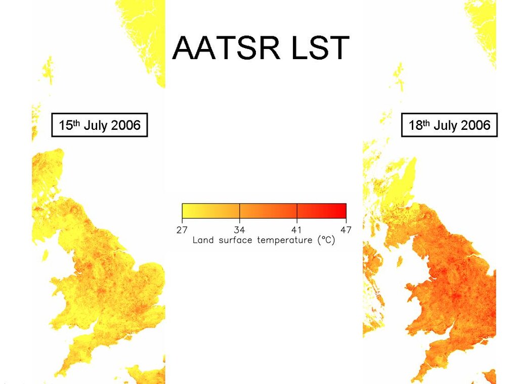 Gedurende een periode van aanhoudend stabiel zomerweer van 15 tot 19 juli, steeg de temperatuur tot record hoogtes in Groot Brittannië. De Britse meteorologische dienst rapporteerde dat de temperatuur op 19 juli een record maximum heeft bereikt voor de maand juli. Ook de luchtvervuiling als gevolg van stikstofdioxide (NO2) is aanzienlijk gestegen. Deze feiten worden dramatisch geïllustreerd door de laatste beelden van twee satelliet instrumenten, de “Advanced Along Track Scanning Radiometer” (AATSR) aan boord van de ENVISAT satelliet van ESA en het “Ozone Monitoring Instrument” (OMI) op de Aura Satelliet van de NASA. De AATSR data laat duidelijk zien hoe snel de temperatuur is gestegen in slechts enkele dagen, terwijl de OMI resultaten de grote toename van NO2 laat zien. Deze toename van temperatuur en vervuiling is vooral extreem in grote stedelijke gebieden, zoals Londen, Birmingham, Manchester en Liverpool, terwijl kleinere meer geïsoleerde steden zoals Leicester ook hoge temperaturen vertonen, maar desondanks een meer gematigd luchtvervuilingniveau laat zien. Landelijke gebieden buiten de invloedssfeer van steden vertonen meer aangename temperaturen en een lagere hoeveelheid luchtvervuiling. Aangezien NO2 vooral wordt veroorzaakt door verkeer en energiecentrales, neemt de hoeveelheid NO2 sterk toe in grote steden bij gebrek aan zowel wind als regen.