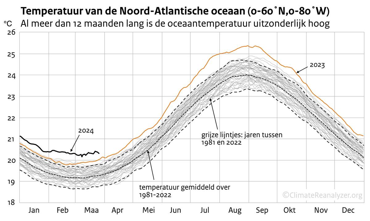 Als de temperaturen zo hoog blijven is dat ook verontrustend voor het orkaanseizoen van 2024. Zeker omdat de huidige El Niño ten einde loopt waardoor weinig factoren een zeer actief orkaanseizoen meer in de weg staan. Er is zelfs een kans van 62% dat de situatie later dit jaar omslaat naar La Niña waarbij orkaancondities juist versterkt zijn. Het record orkaanseizoen van 2017 met de catastrofale orkanen Harvey, Irma en Maria was dan ook tijdens La Niña. Maar ook toen speelden hoge zeewatertemperaturen een belangrijke rol.