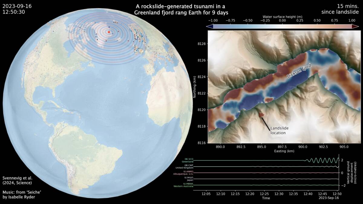 In september 2023 zorgde een grote aardverschuiving in Oost-Groenland ervoor dat de aarde negen dagen lang trilde. Op 16 september stortte 25 miljoen kubieke meter rots en ijs in de Dickson Fjord, wat een tsunami veroorzaakte. Het water bleef op en neer bewegen in de smalle fjord, waardoor de trilling wereldwijd werd waargenomen.