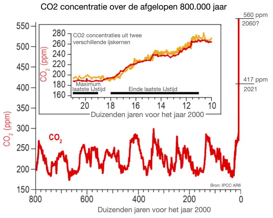 De CO2-concentratie is sinds het begin van de industriële revolutie gestegen van 280 ppm naar 415 ppm. Dit is de hoogste waarde sinds zeker 800.000 jaar (figuur 1). Volgens het IPCC moeten we er serieus rekening mee houden dat een verdubbeling tot 560 ppm in 2060 een feit is. Tot hoeveel opwarming dat zal leiden is afhankelijk van de klimaatgevoeligheid van de planeet.