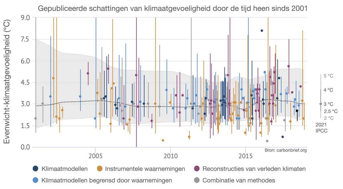 Door de genoemde onzekerheden lopen de schattingen van klimaatgevoeligheid ver uiteen. Figuur 2 laat zien dat ondanks 40 jaar aan wetenschappelijk onderzoek en honderden studies de bandbreedte nog altijd ongeveer hetzelfde is. Door echter de verschillende methodes te combineren, is het mogelijk om de onzekerheid te verkleinen.