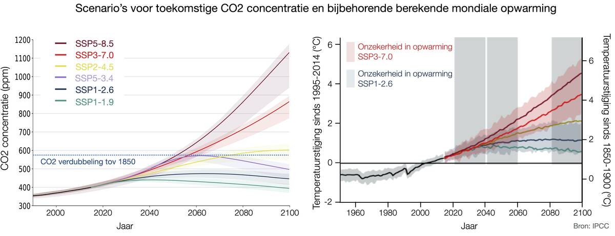 Op welke temperatuur de planeet gaat uitkomen aan het eind van deze eeuw hangt af van hoeveel CO2 we nog gaan uitstoten. Daarvoor zijn verschillende scenario’s uitgewerkt. De onzekerheid in de toekomstige uitstoot geeft een grotere spreiding in de temperatuur in het jaar 2100 dan de onzekerheid in de klimaatgevoeligheid (figuur 3). Verdere opwarming van de planeet kan worden tegengegaan door de uitstoot van CO2 zo snel mogelijk tot nul te reduceren.