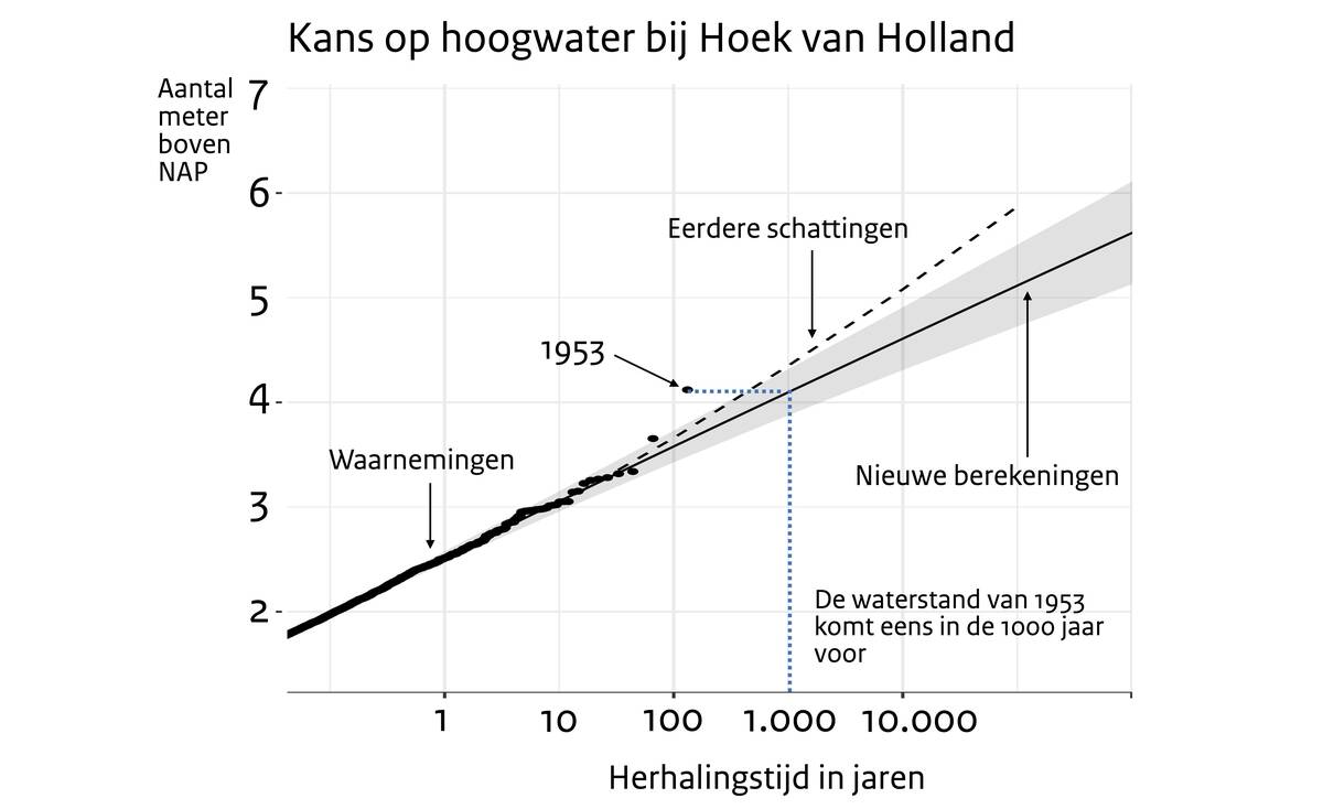 Een belangrijke uitkomst uit het onderzoek is dat ’1953’ zeldzamer blijkt te zijn dan eerder werd berekend. Met de nieuwe methode schatten we dat voor Hoek van Holland gemiddeld eens in de 1000 jaar een waterstand bereikt wordt die gelijk is aan die van de rampzalige stormvloed van 1953. Daarmee is de kans dat zo’n uitzonderlijke gebeurtenis in een honderdjarige meetreeks terechtkomt of in een mensenleven optreedt ongeveer 10 procent - niet groot maar zeker niet verwaarloosbaar. Door de Deltawerken en het versterken en verhogen van de overige dijken zijn we tegenwoordig bestand tegen een dergelijke stormvloed.