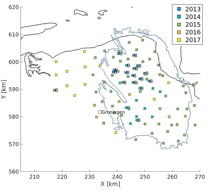 Het KNMI meet sinds 2013 de grondversnellingen met het zogenaamde B-netwerk. Dit is een netwerk van 17 versnellingsmeters, die in gebouwen en huizen geplaatst zijn. Een installatie als deze is internationaal gebruikelijk. Hier is door de stakeholders destijds voor gekozen om aan de randvoorwaarden van stroom- en internetvoorzieningen te voldoen, snel te kunnen installeren met beperkte middelen en de versnellingsmeters te kunnen beschermen tegen weersinvloeden en diefstal. Tussen 2014 en 2017 zijn hier de versnellingsmeters van het zogenaamde G-netwerk aan toegevoegd. Het gaat om 79 versnellingsmeters die opgesteld zijn in het open veld aan het aardoppervlak, ook wel G0 genoemd. Daarnaast zijn er 276 seismometers aan het netwerk toegevoegd. Deze worden G1 tot en met G4 genoemd en zijn geplaatst in boorgaten op diepten van 50, 100, 150 en 200 meter.